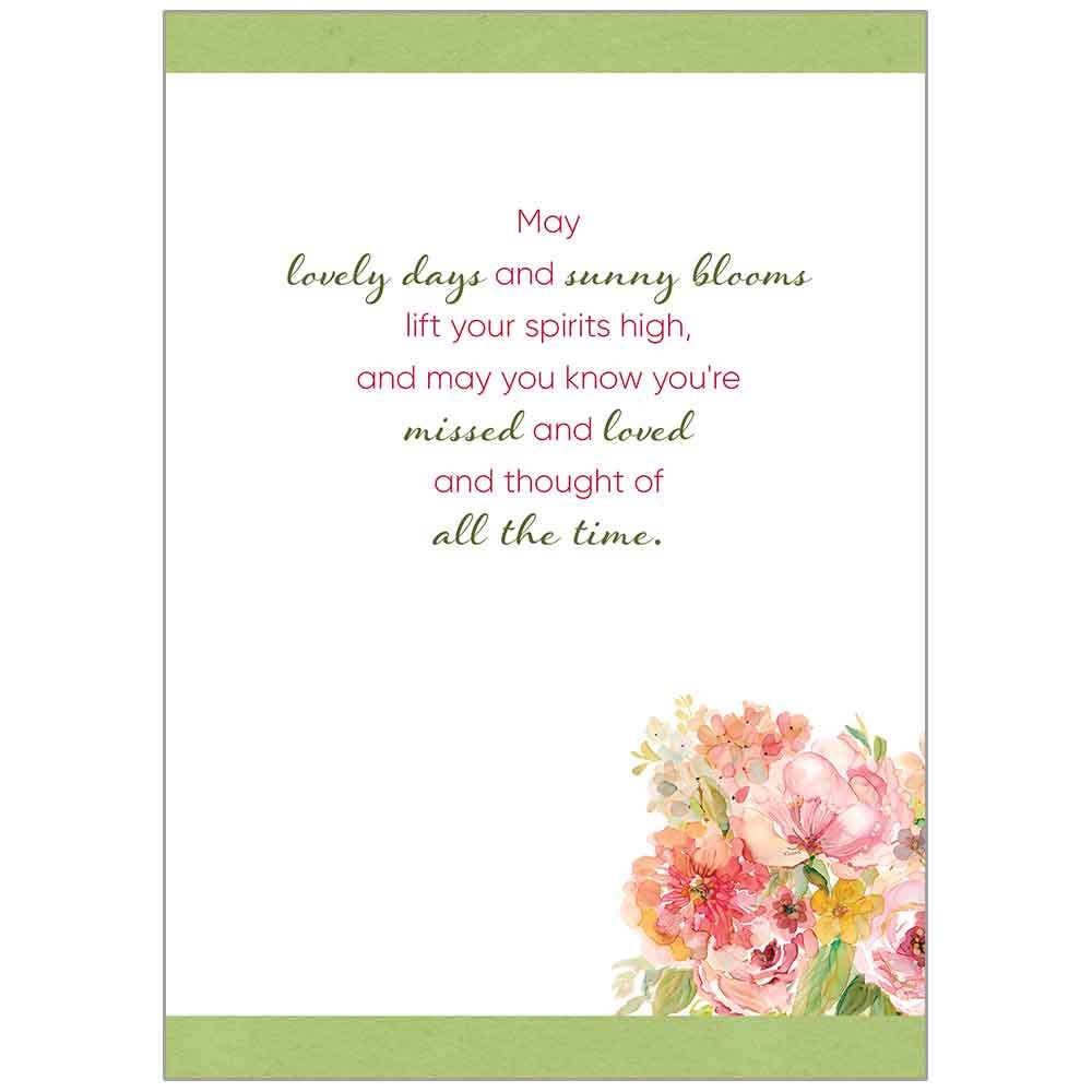 Make someone's day with Nature's Joy Get Well Card. This charming card depicts a colorful arrangement of pink flowers, including stunning roses, elegantly presented in a vase. The beautiful colors and compassionate words will bring comfort and healing to anyone who is feeling under the weather or requires some sensitive care. Send your best wishes with this thoughtful and upbeat card.