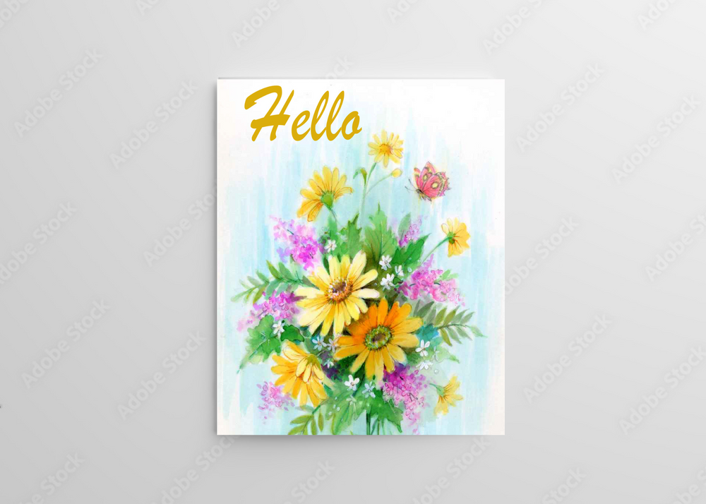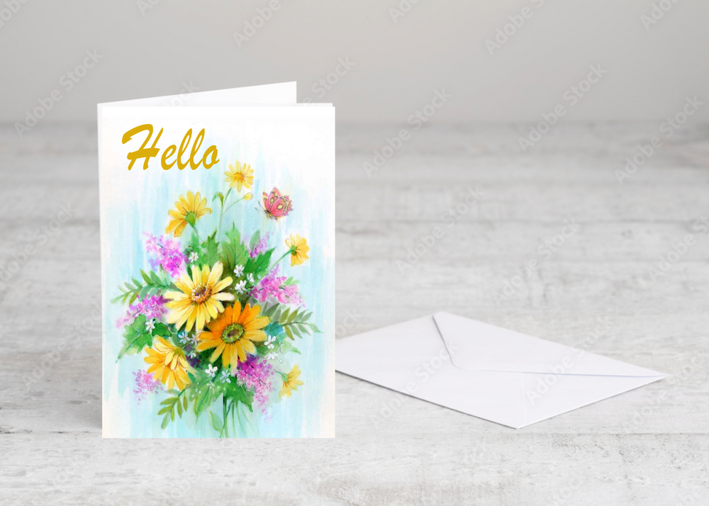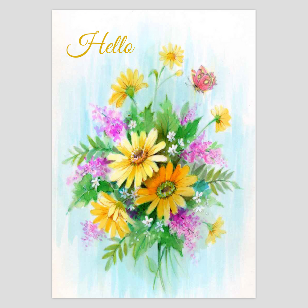 The Hello greeting card is a meaningful greeting perfect for expressing love, friendship, or missing someone. This beautifully painted bouquet of sunflowers and daisies, presented in a vase, makes a lively centerpiece. Delicate butterflies lend a touch of elegance to this card, creating a peaceful and lovely reminder of nature's beauty. Say hello with elegance and sentiment.