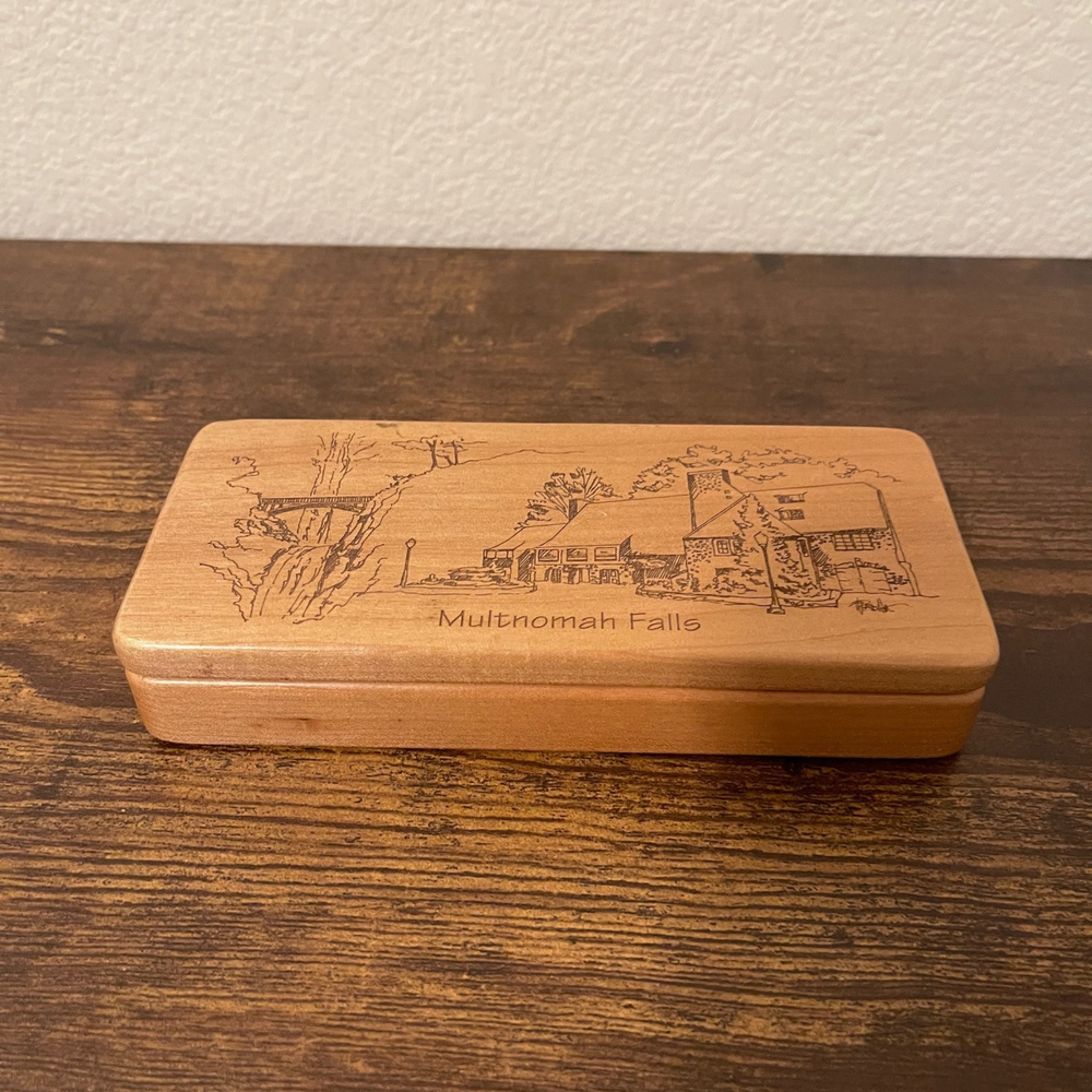 This charming vintage box features Oregon's breathtaking Multnomah Falls on its hinged lid, capturing the 620-foot cascade in stunning detail. It is one of the tallest year-round waterfalls in the United States and is the most visited natural recreation site in the Pacific Northwest. This pencil box is in great vintage condition and is perfect for holding pencils, pens, jewelry, souvenirs, or as a keepsake collectible. With its spacious interior and beautiful craftsmanship, this wooden keepsake is perfect for storing treasures while bringing a touch of Pacific Northwest magic to your space. More than just a storage box, it's a beautifully crafted keepsake that brings a piece of Pacific Northwest wonder to your home.