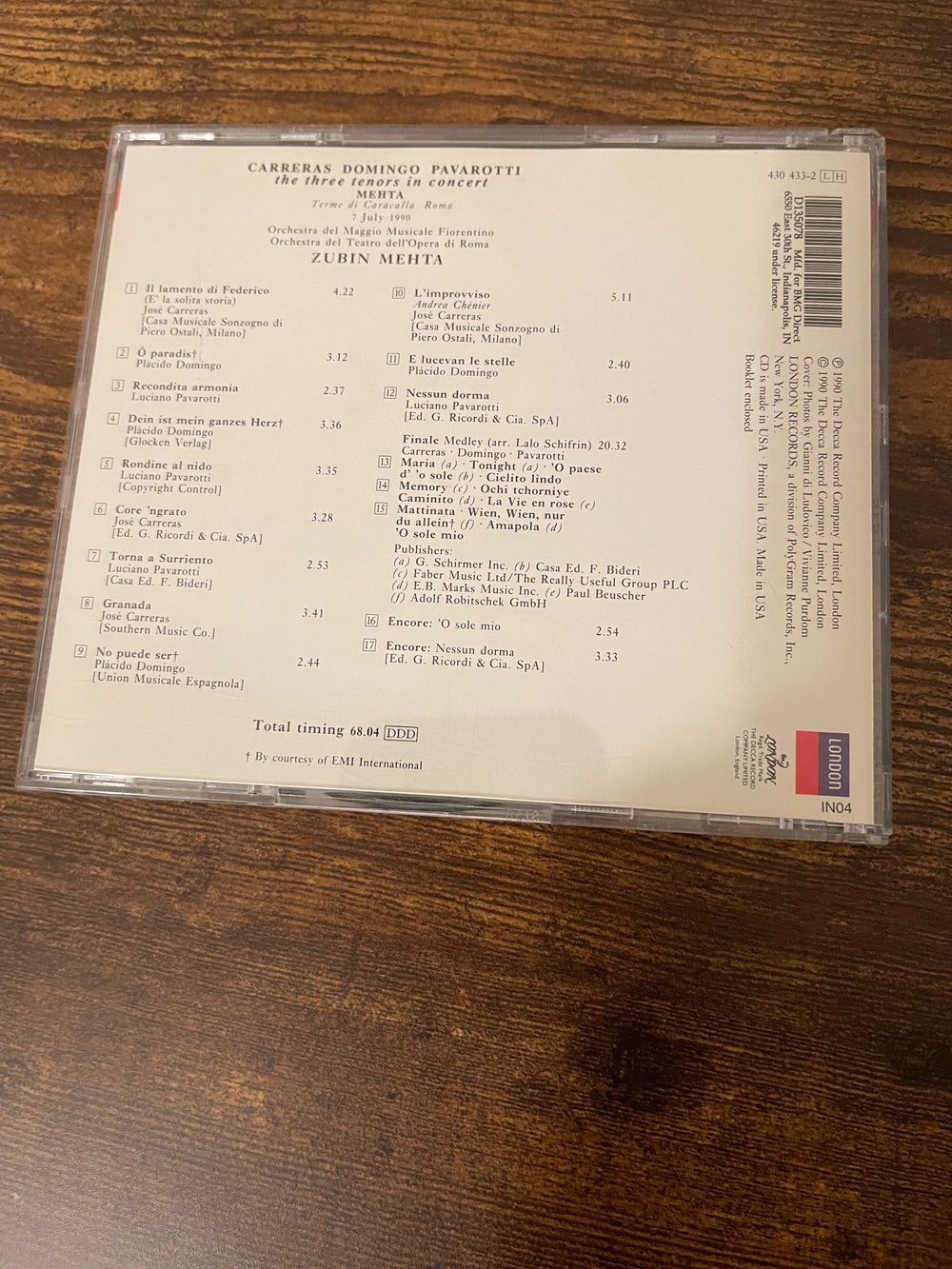 The Three Tenors in Concert was a famous performance in 1990 by opera singers Luciano Pavarotti, Placido Domingo, and Jos Carreras. The concert performed in Rome, Italy, featured arias from operas by Verdi and Puccini, as well as other Italian hits. The concert was held at the Baths of Caracalla, an open-air venue that was used for the Rome Opera in the summer. Their debut concert became the best-selling classical album of all time. The concert features the most famous Italian opera arias from Tosca, Rigoletto, and Turandot, followed in the second part by beautiful Neapolitan songs. This CD includes 17 beautiful operatic presentations.