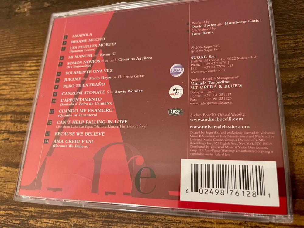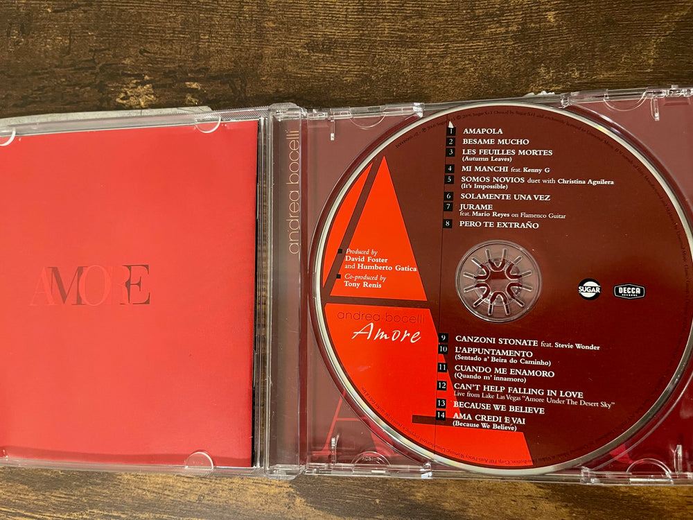 - Andrea Bocelli’s 2006 Amore CD includes 14 songs. This CD includes romantic songs ranging from the 1920s to the 1980s.