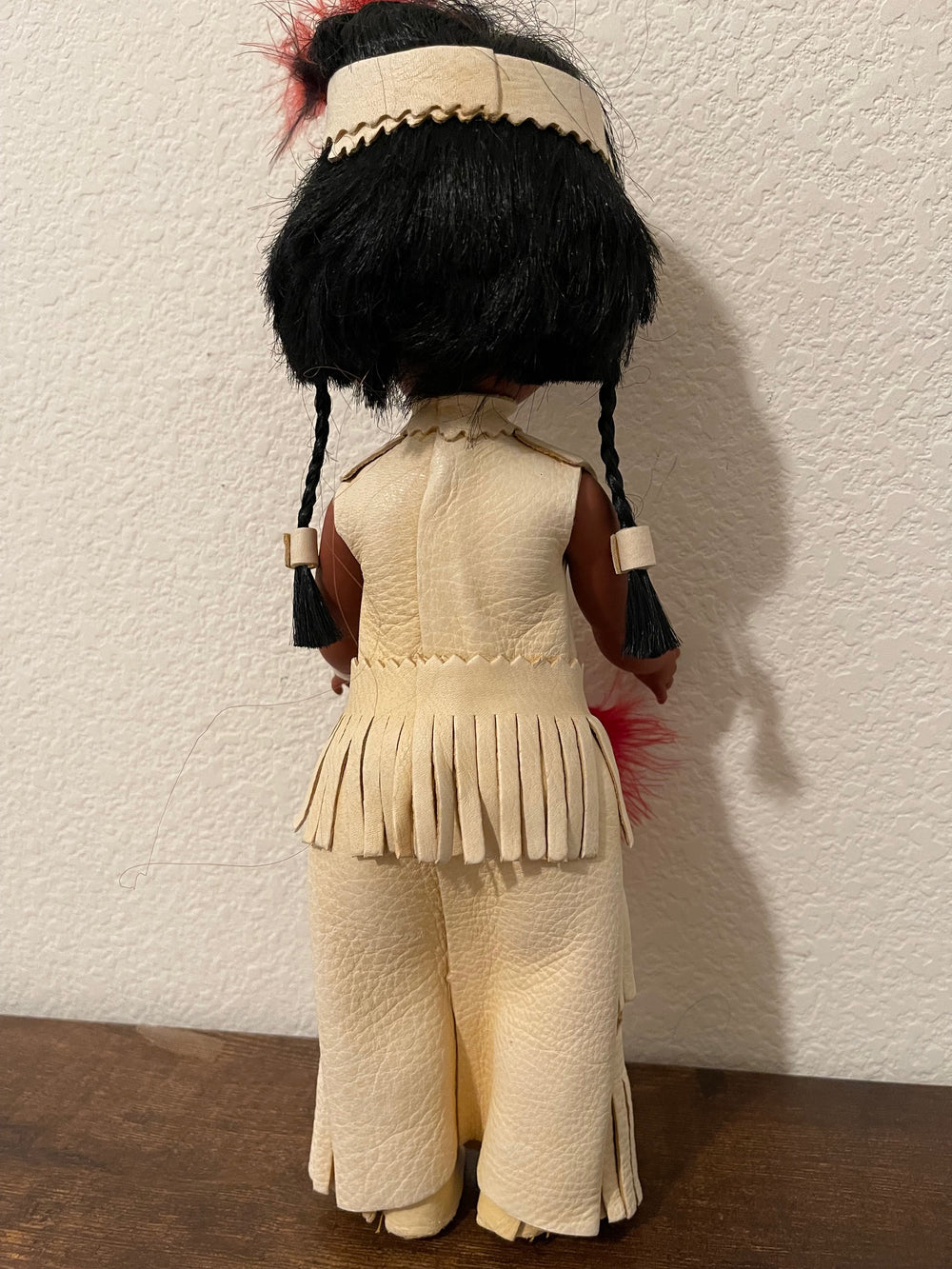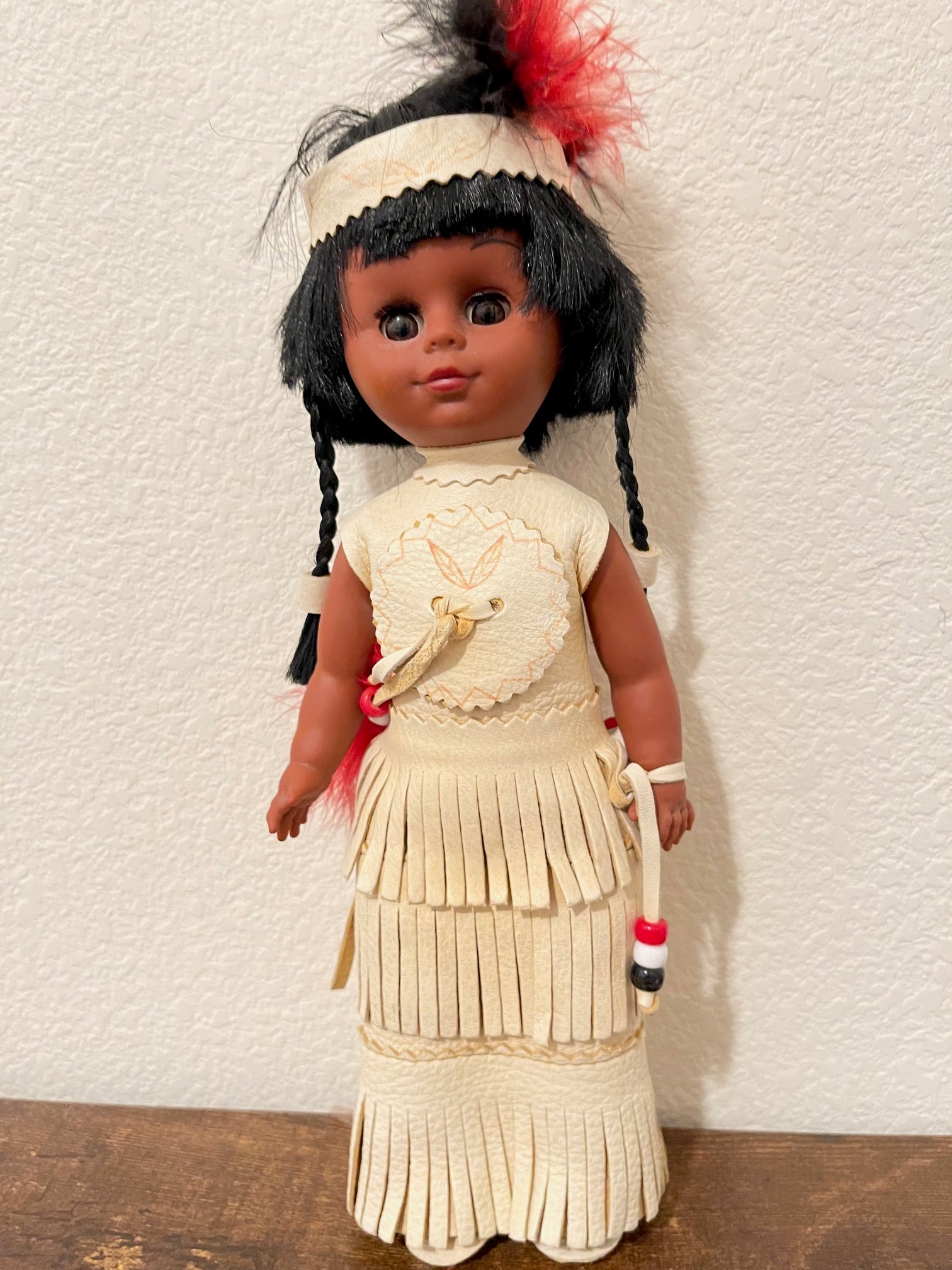 Step back in time with this charming vintage Native American doll. She is beautifully preserved and looks like a collector's piece. Her expressive double papoose eyes blink dreamily, while her head and arms are movable. Dressed in an intricately detailed faux leather dress adorned with delicate beadwork. Her traditional moccasins complete the authentic look, though they do have some slight glue marks on their soles. This is a doll that is pre-owned but in excellent condition..