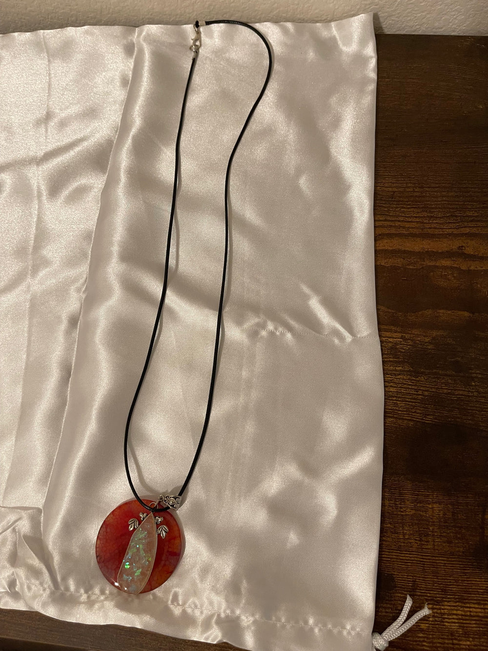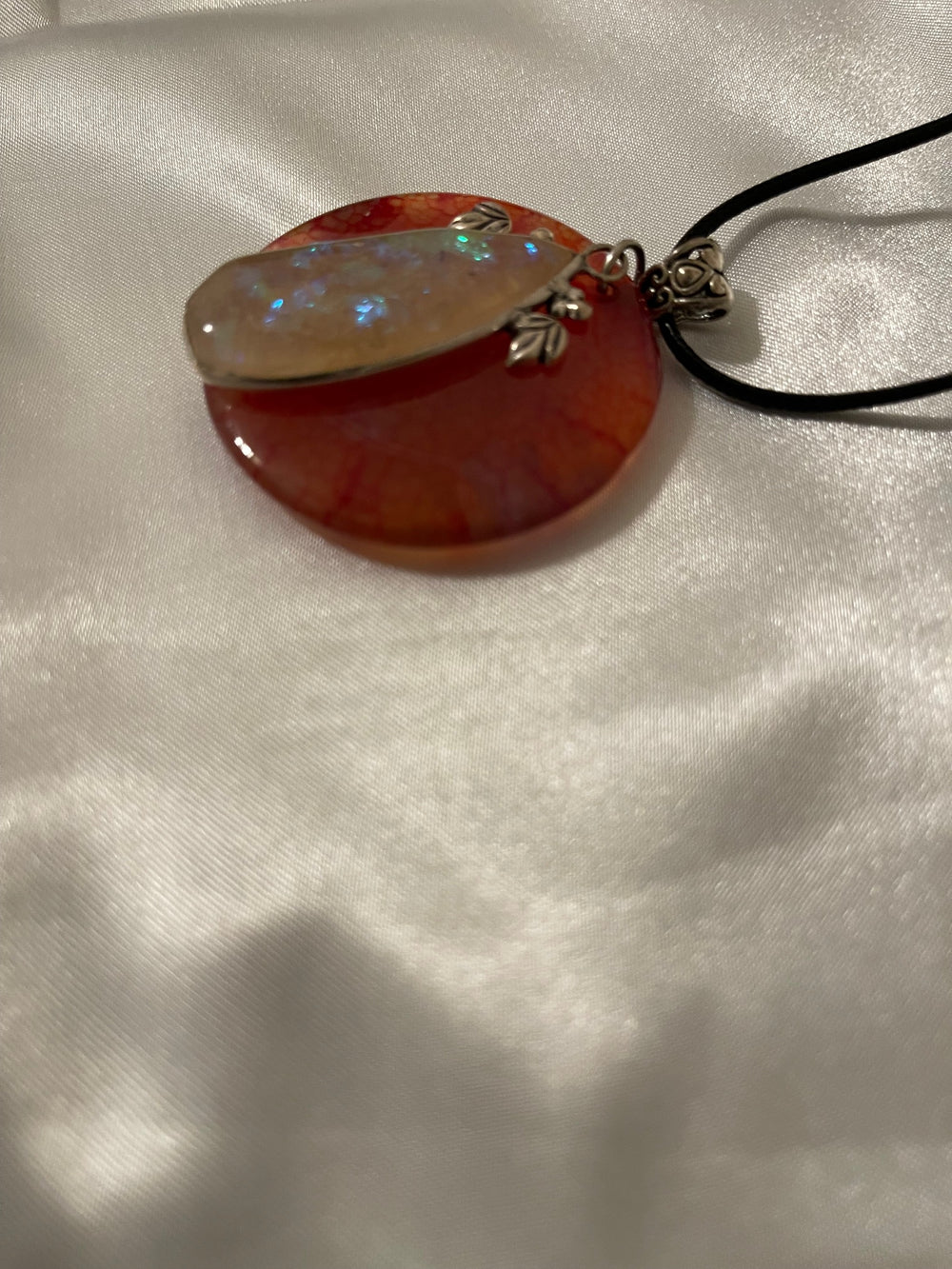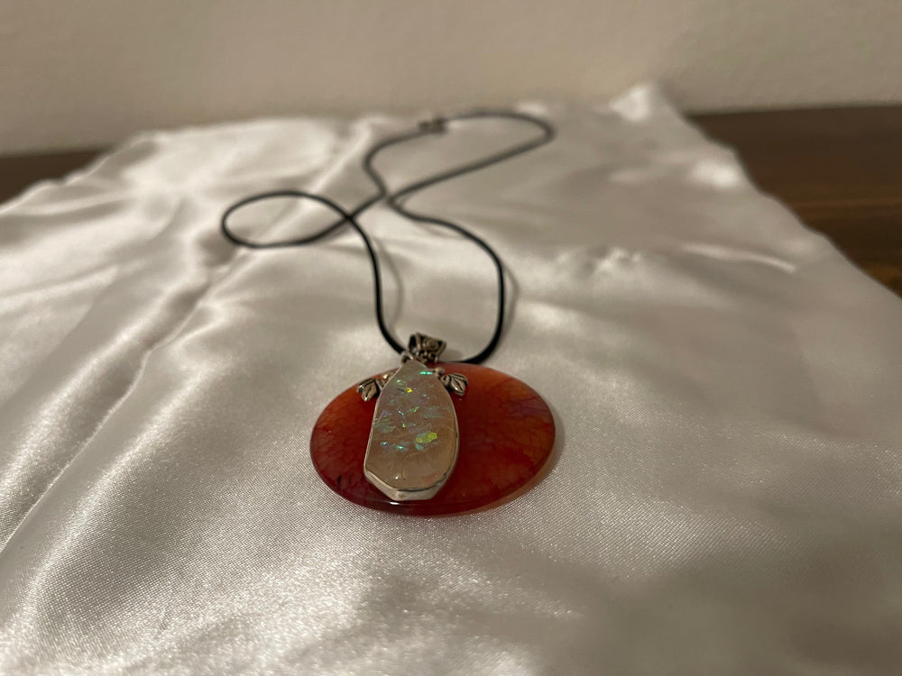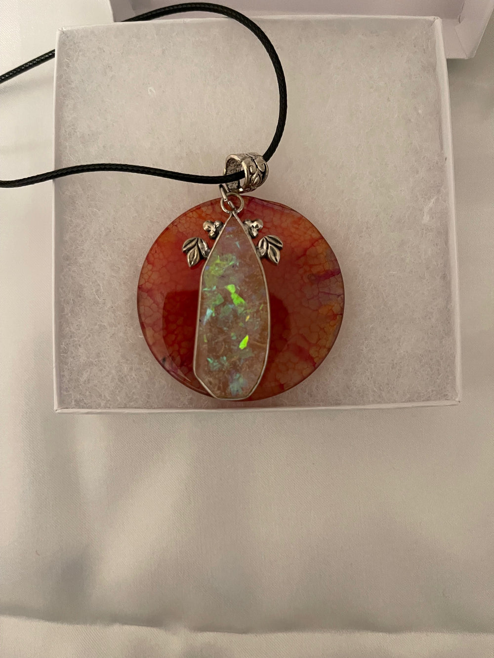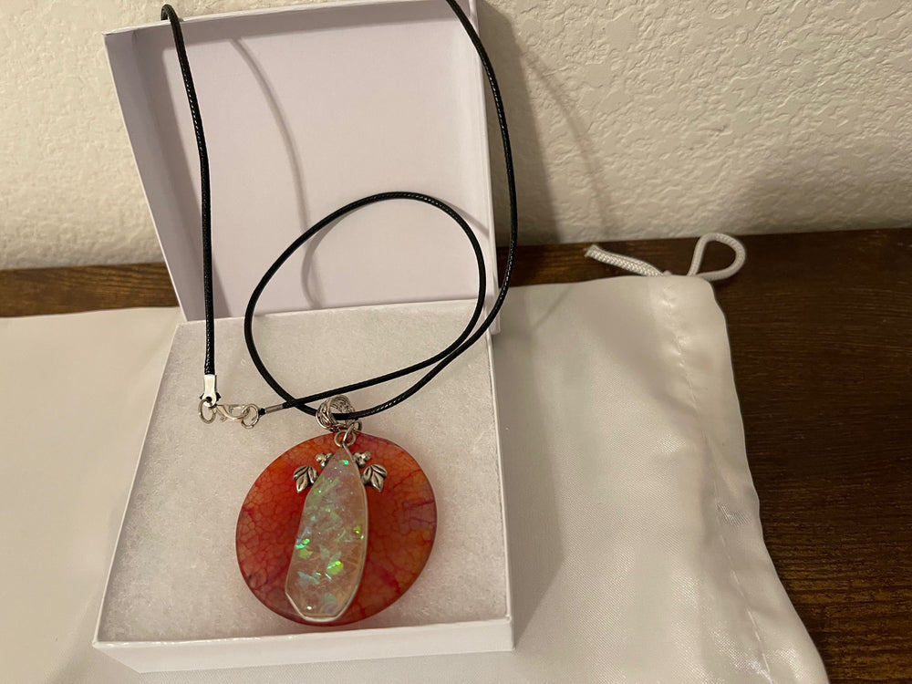 Beautiful handmade necklace made with Dragon Veins and Opal stone. The pendant necklace is on a leather cord with a clasp and comes in the box featured in photos. Never worn, perfect for special occasions or everyday wear.