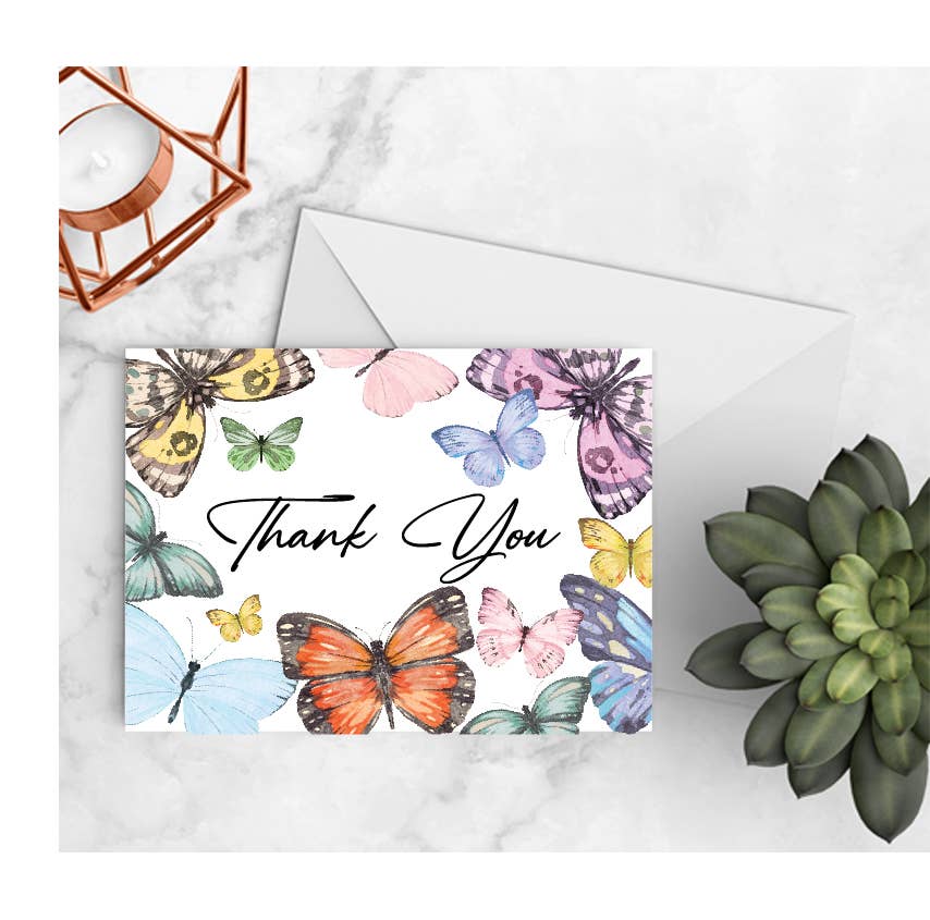 You can gracefully and stylishly convey your gratitude with Butterfly Thank You cards. These notecards, which include pretty pink and blue butterflies, are ideal for conveying sentimental sentiments. Our Butterfly Thank You cards will make a lasting impression on any special occasion, be it a wedding, birthday, or other milestone event. Place your order right now, and watch your gratitude soar. An up-close view of a gorgeously crafted Butterfly Thank You card. The card radiates beauty and charm with its beautiful design of pink and blue butterflies set on a white backdrop.